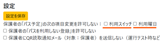 - 「児童がバスに乗らないことを確認者(保護者)が登録できないようにする」:運用上、児童がバスを利用しない登録をする機能を利用したくない場合はこのチェックをONにします。