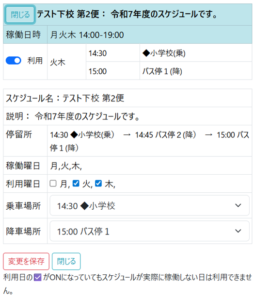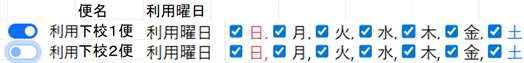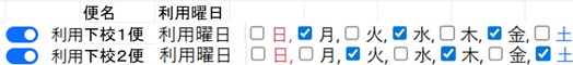 曜日によって利用したい便を変えたいときに使います。当該便の曜日のチェックボックスがONであること、かつ利用スイッチがONであることの条件を満たした曜日に乗降予定者リストに児童の名前が出ます。