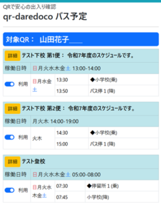 - 「確認者にQR読取通知メール(対象:確認者)を送信しない」: 運行テスト時など、保護者へのQR読取通知を抑制しつつ、QRを読み取ることができます。バスモードでないときに読み取った場合、読取通知は送信されます。